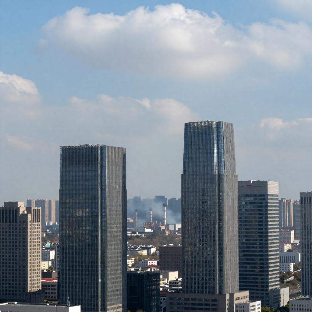 Sunlit Glass Skyscrapers Amid Industrial Smoke
