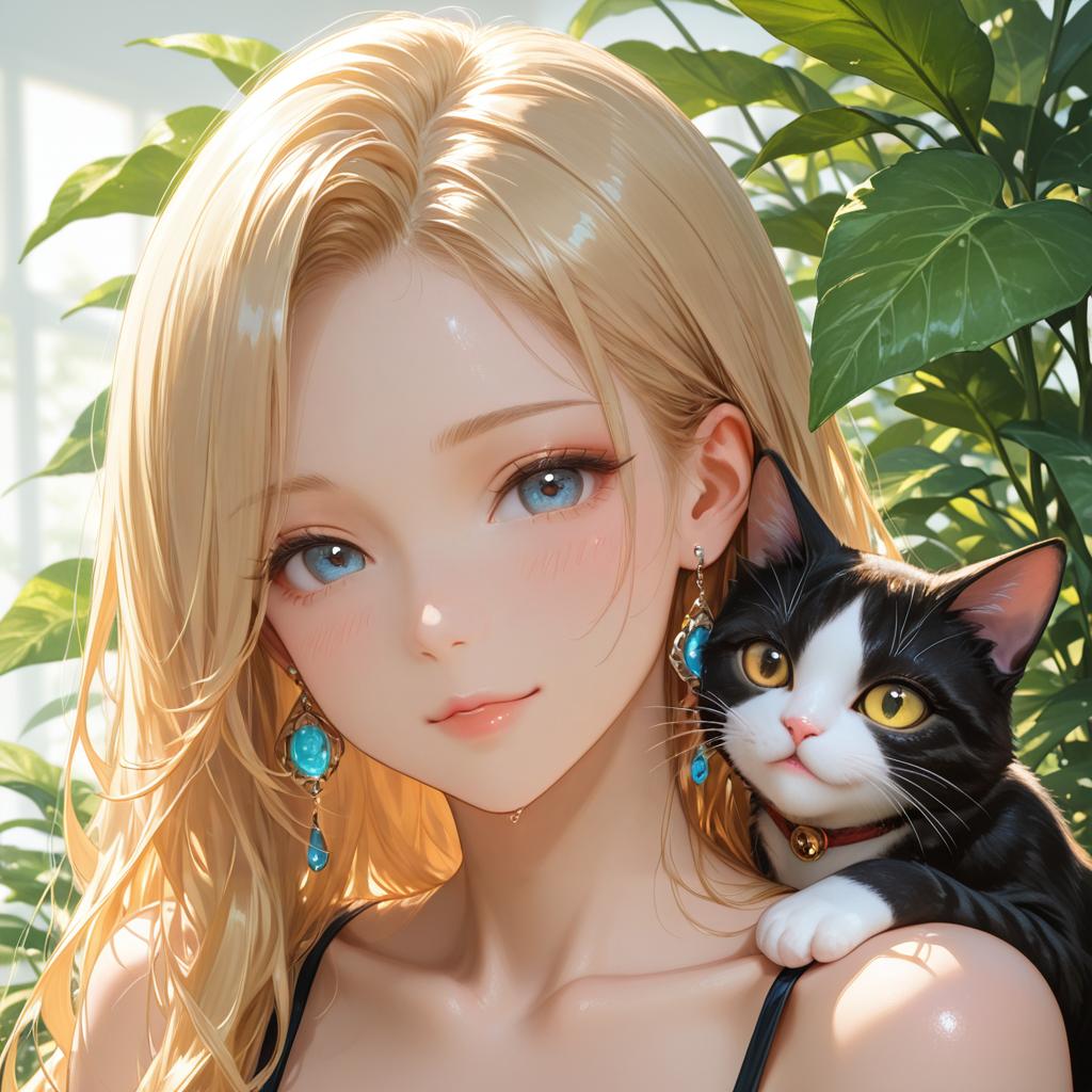 Young Girl with Blue Floral Headscarf Holding White Cat