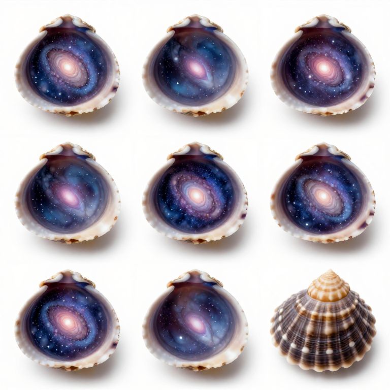 Seashells pulse with liquid constellations, each containing a self-sustaining galaxy visible only to those who listen closely.