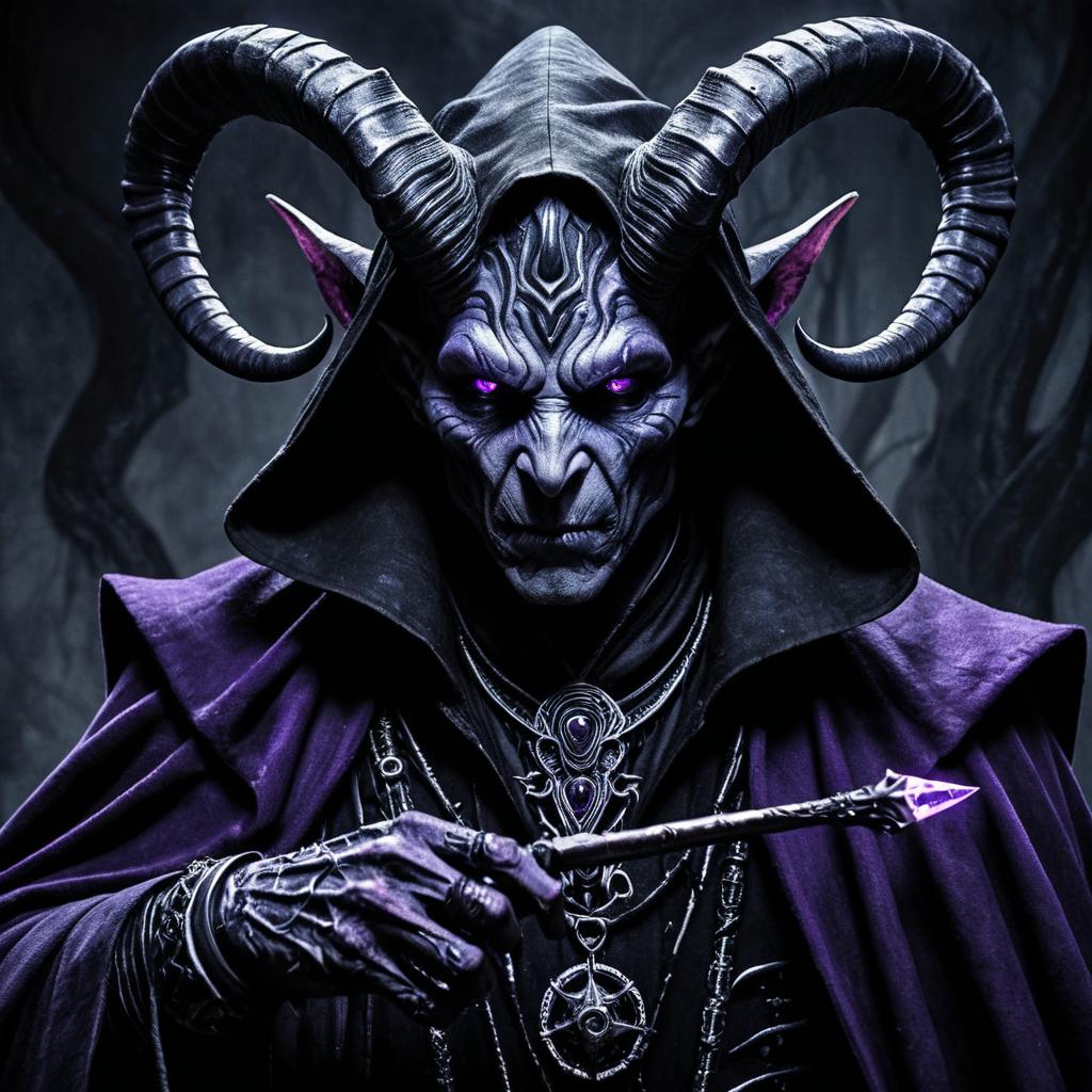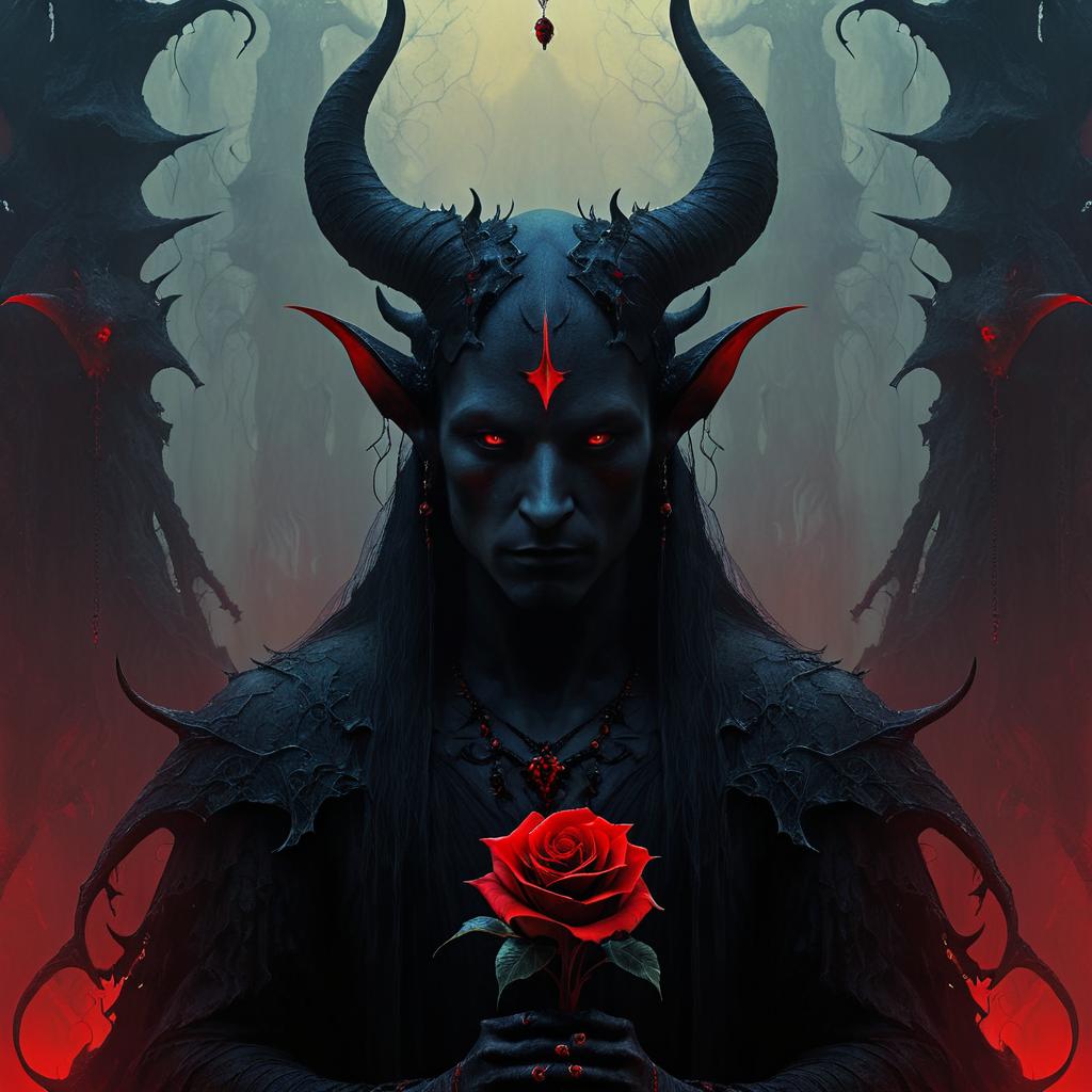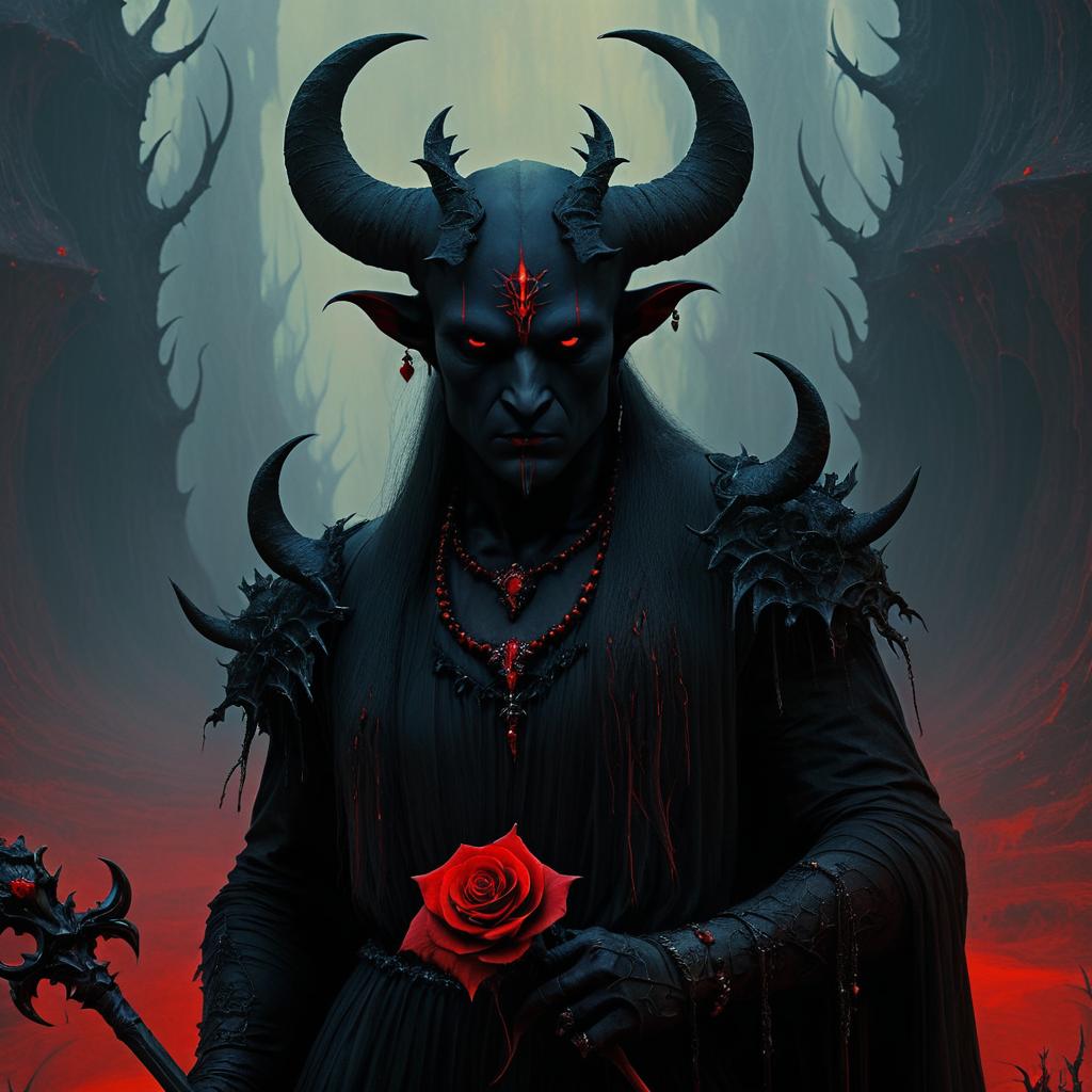Beautiful demon with red horns holding a black rose, set in a dark fantasy world. Styled in high detail by Zdislav Beksinski.
