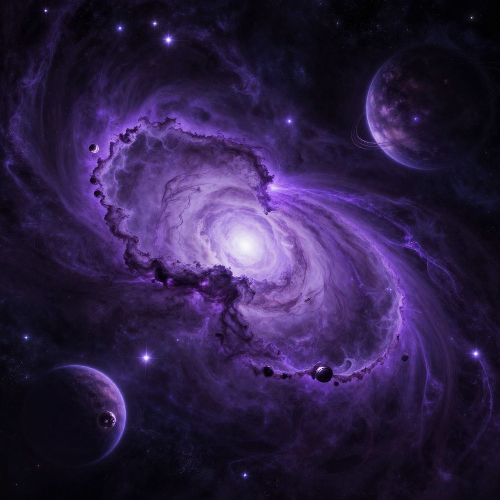 Morados abstract cosmic landscape, swirling purple nebulae with stars and planets glowing in shades of violet, vast and mysterious space environment, cosmic energy flowing through, high detail with deep contrasts and radiant highlights.
