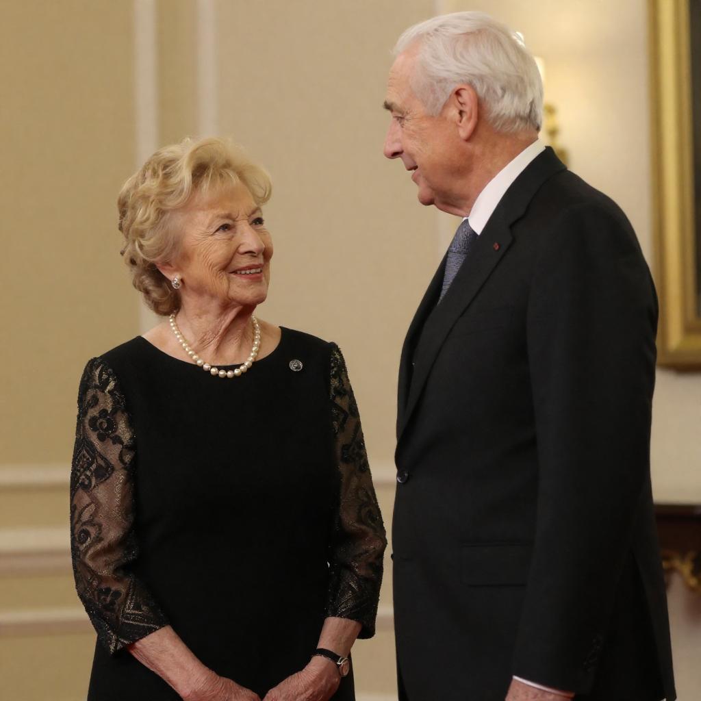 Black-and-white photograph of a smiling man in a dark suit shaking hands with a woman wearing a plaid coat and white headband. The woman has glasses and holds a small purse. They stand indoors in a formal room with a classical statue visible in the background.