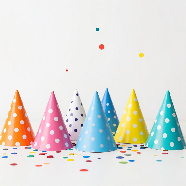 Five vibrant birthday party hats with polka dots—orange, pink, white, light blue, yellow, and teal—are neatly arranged in a row on a white surface, surrounded by colorful confetti that cascades both above and around them, creating a festive and cheerful atmosphere.
