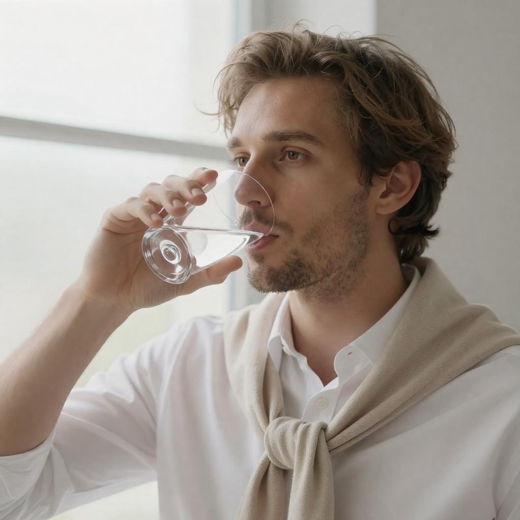Bearded man with long, wet hair, shirtless, sitting in a modern bathtub. Holding a glass of red wine, looking upward. Wooden wall in background, white bowl and plate on a wooden tray in front. Bathtub has metal support.
