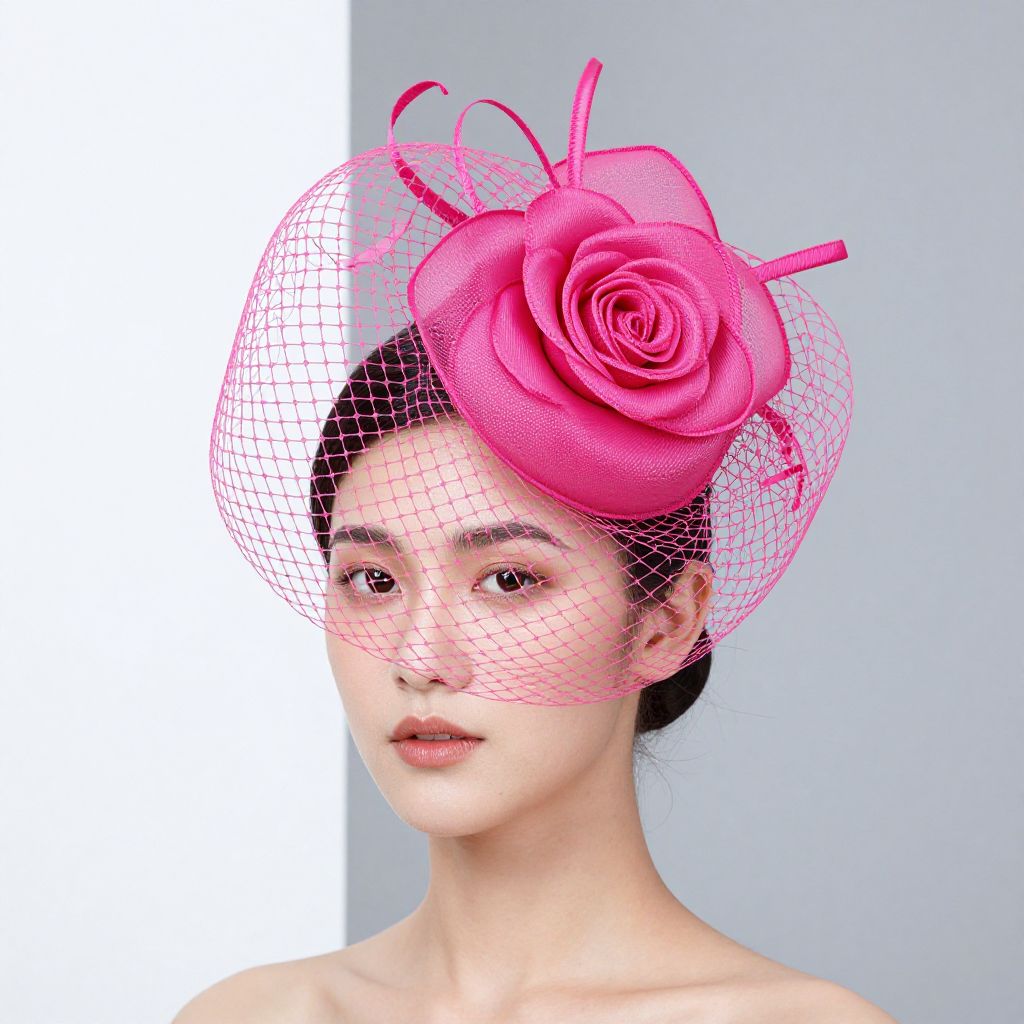 Elegant woman wearing a vibrant hot pink fascinator featuring a large rose flower and sheer netting veil, showcasing a stylish bridal accessory against a minimalist backdrop.