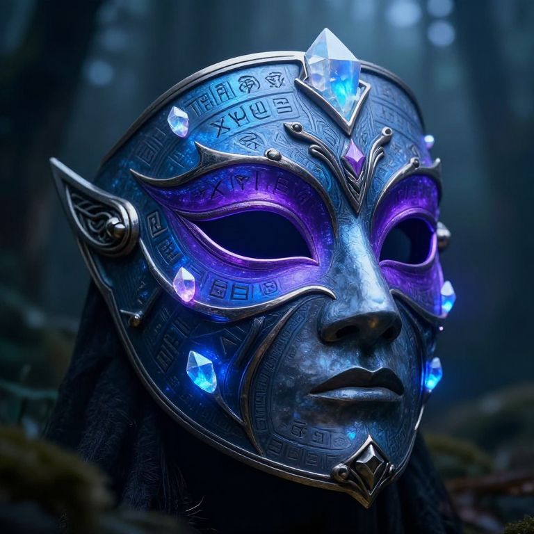 Fantasy mask concept art featuring an intricate blend of ancient runes and glowing crystals, set against a misty forest background, with ornate metallic details and a mystical aura radiating from the mask's eye openings in vibrant blues and purples.