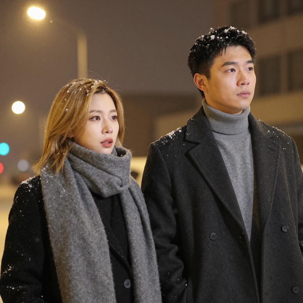 Three people standing close together in a snowy landscape. Snow-covered hats, winter clothes with patterns. Snow on shoulders and ground. Man on left with green hat, brown coat, serious expression. Woman in middle with blue hat, red patterned coat, smirking. Man on right with red plaid hat, dark coat, skeptical expression. Small wooden shack in background. Snow falling. Realistic, digital illustration.