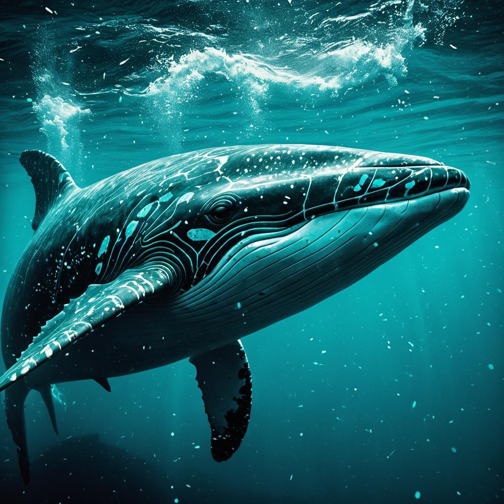 Portrait of mystical turquoise whale rendered with a vibrant, detailed aesthetic.