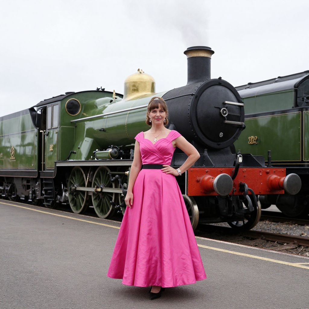 Photograph of a smiling woman in a bright pink, vintage-style ball gown standing beside a green steam locomotive on a railway platform.