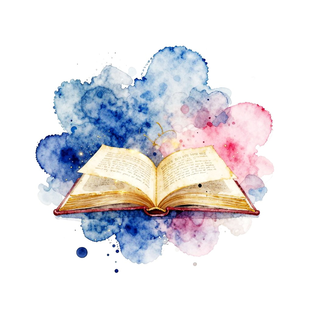 Watercolor book tattoo art combining classic literary elements with abstract colorful washes, golden pages glowing amid bright blue and pink hues, creative and elegant