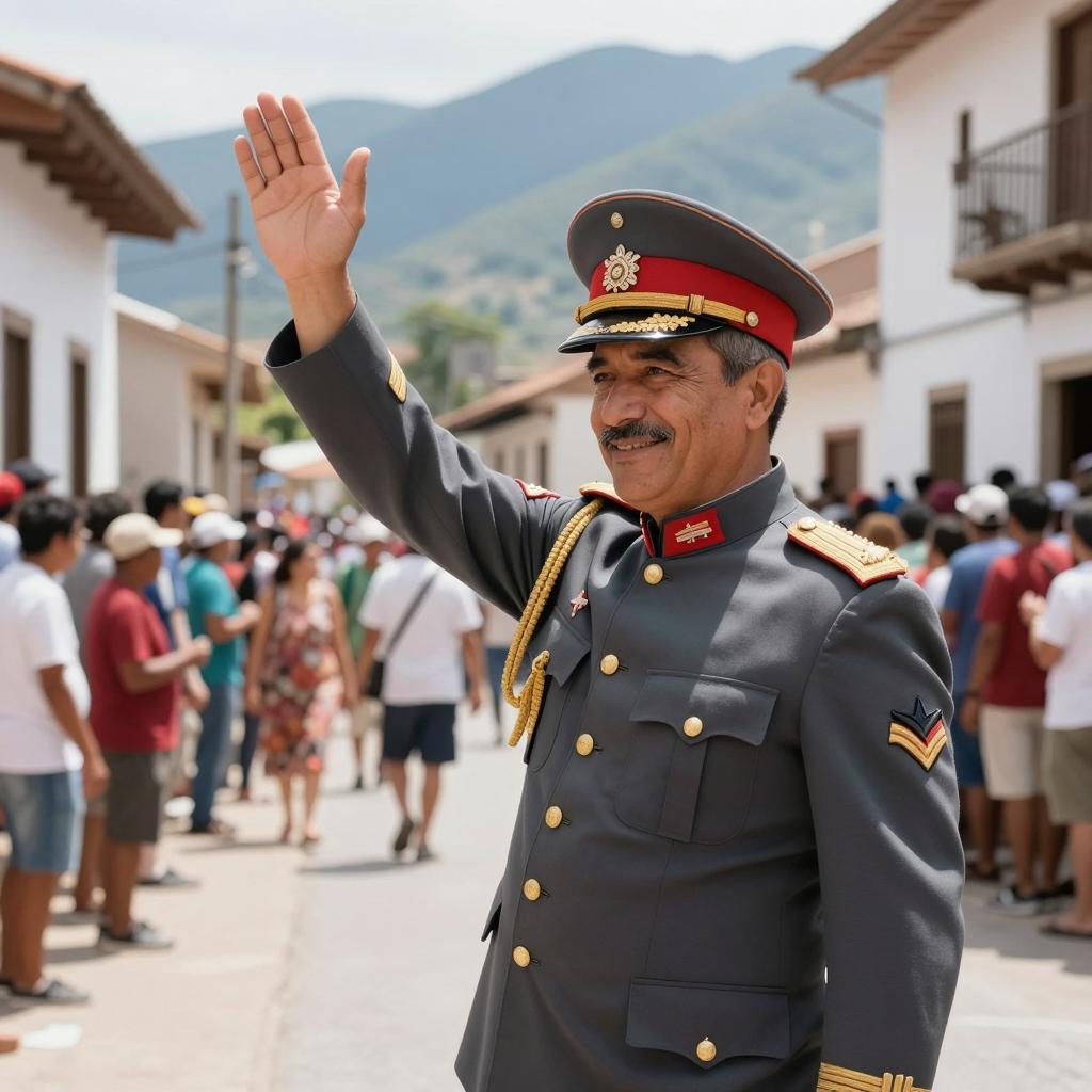 Photograph of a middle-aged man in a dark gray military uniform with gold epaulettes and a red and gold hat, smiling, with raised right hand. Large crowd fills a sunlit, narrow street with white buildings in the background. Mountains in the distant background. Man has dark hair, mustache, and fair skin. Crowd is dense, colorful, and diverse. Bright, clear day.