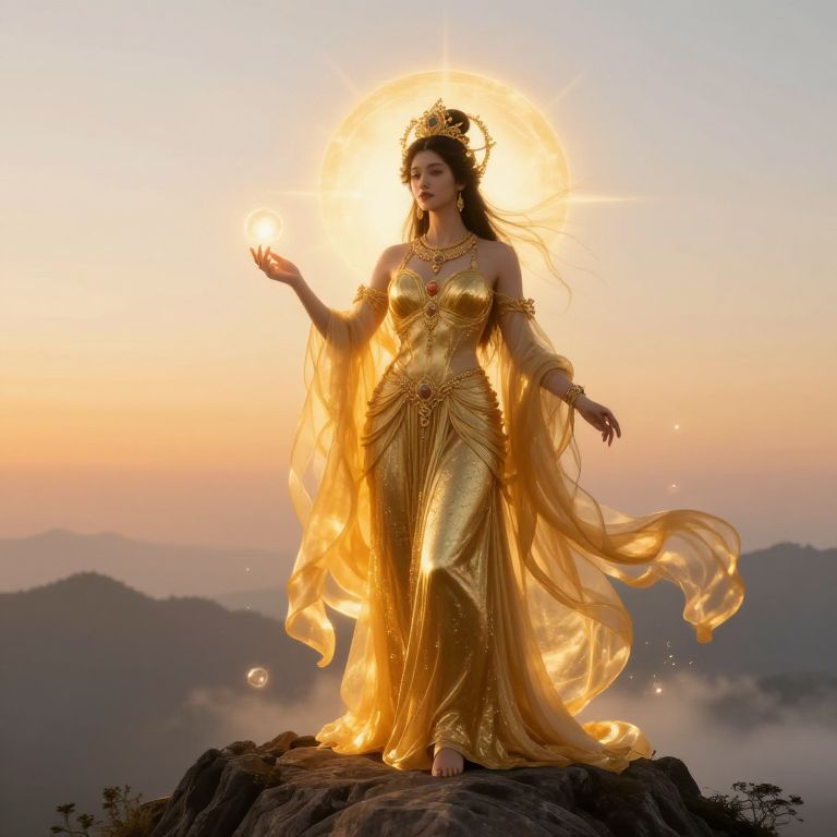 Photograph of a serene woman standing on a rocky peak at sunset, wearing an elegant, golden, flowing dress with sheer, billowing sleeves. She has long, dark hair adorned with a golden crown, and her skin is a warm, light brown. Her right hand is raised, palm open, while her left hand is gently extended to the side. A radiant halo of sunlight surrounds her head, casting a divine glow. The background features a misty, mountainous landscape with soft, pastel hues of orange, pink, and blue. Small, glowing orbs float around her, adding a magical, ethereal quality to the scene.