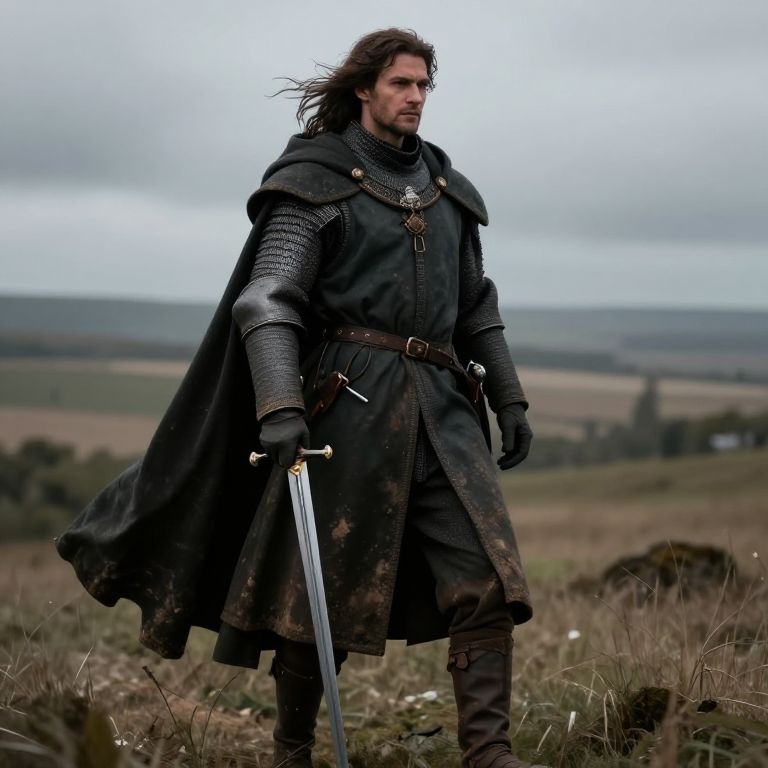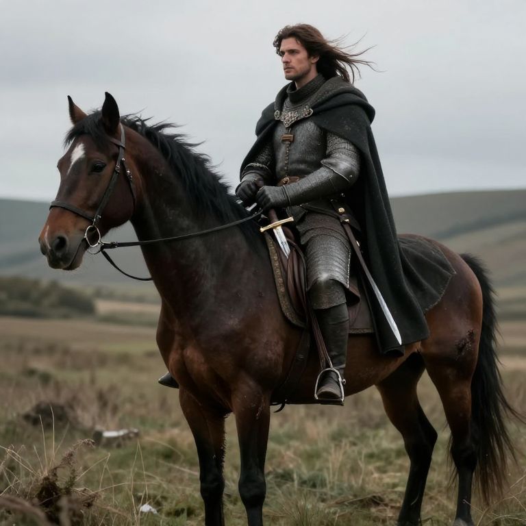 Photograph of a medieval-style knight with long brown hair and a serious expression, riding a dark brown horse. The knight wears a black cloak over silver, chainmail armor, and black gloves. He holds the reins with a black-gloved hand, and a sword is sheathed at his side. The horse has a black mane and a brown coat. The background features a cloudy sky, rolling green hills, and a grassy, slightly overgrown field. The image has a realistic, slightly dramatic style, with a focus on the knight and horse in the foreground.