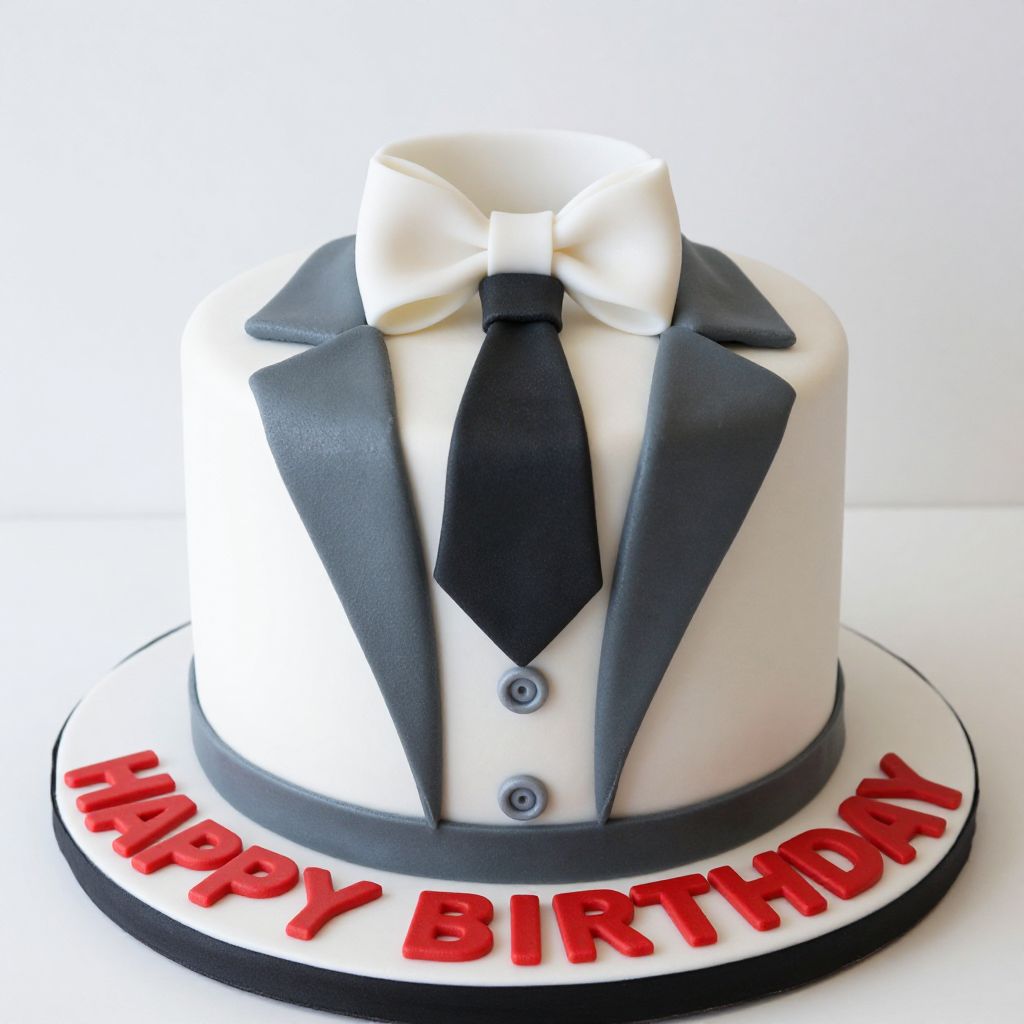 Elegant suit-and-tie-themed birthday cake featuring a white base, gray lapels, a black tie, two white bow ties, and three silver buttons, all intricately crafted in fondant, with bold red \"HAPPY BIRTHDAY\" lettering encircling the base.