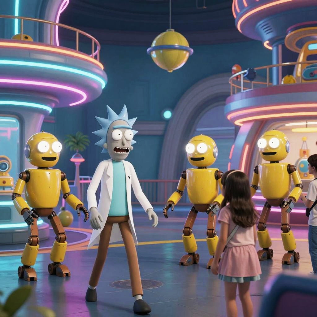 Rick and Morty AI theme park scene, animatronic robots of Rick and Morty interacting with visitors, futuristic amusement rides with neon lights, vivid and playful atmosphere, detailed sci-fi architecture with a touch of cartoon surrealism