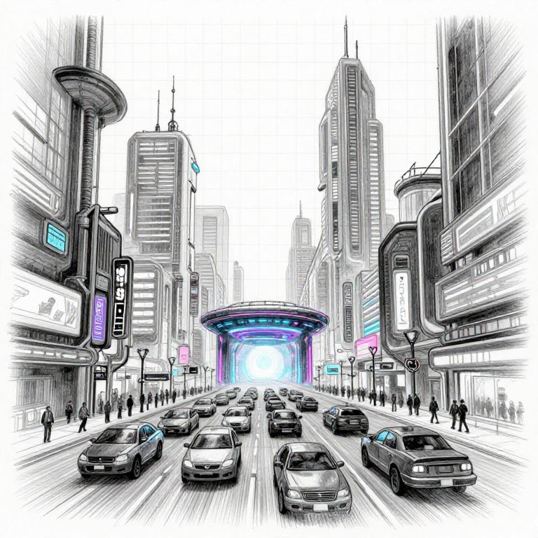 Grid pencil sketch of a ciberpunk neon futuristic city, sky vehicles, traffic jam, portal traveling,