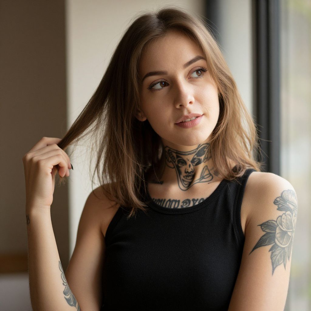 Photograph of a young woman with light brown, shoulder-length hair and tattoos covering her neck and both arms. She's wearing a black sleeveless top and looking thoughtfully to the side with a slight smile. She's holding a strand of her hair with her right hand. The background is softly blurred with natural light filtering through what appears to be a window, giving the scene a warm, gentle glow.