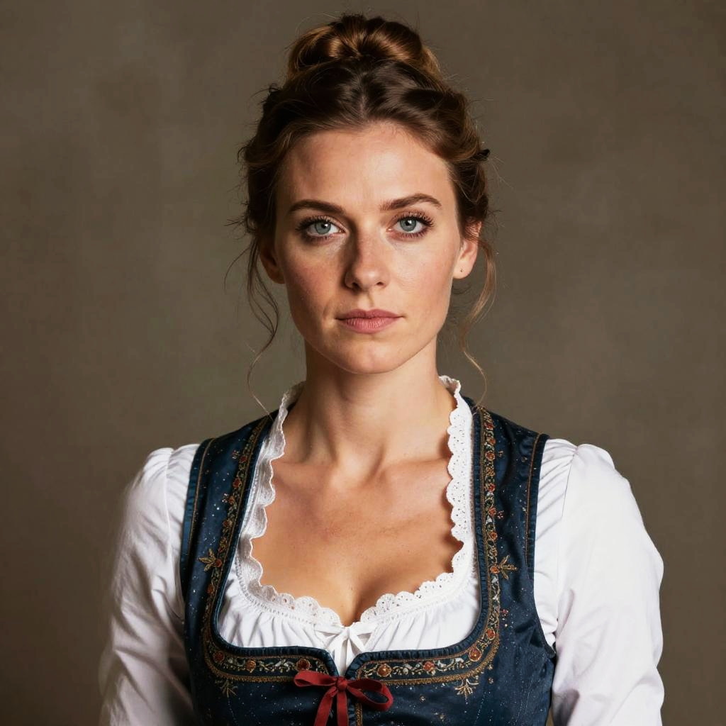Masterpiece, absurdres, fine detail, HDR, highly detailed face and eyes, photorealistic, dirndl, a woman in traditional bavarian dress poses for a picture, german woman, wearing a dirndl