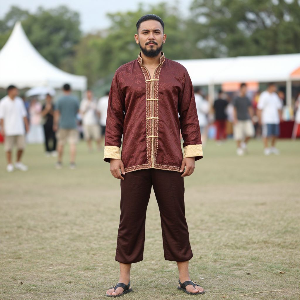 Photograph of a medium-built man with a short black beard and trimmed hair, standing on a grassy field. He wears a maroon traditional tunic with gold embroidery and black pants, paired with black sandals. The tunic has long sleeves and a high collar. The background shows a blurred crowd of people and white tents, suggesting an outdoor event. The man stands confidently with his hands at his sides. The sky is partly visible, with trees in the distance. The overall image has a bright and slightly overexposed quality.
