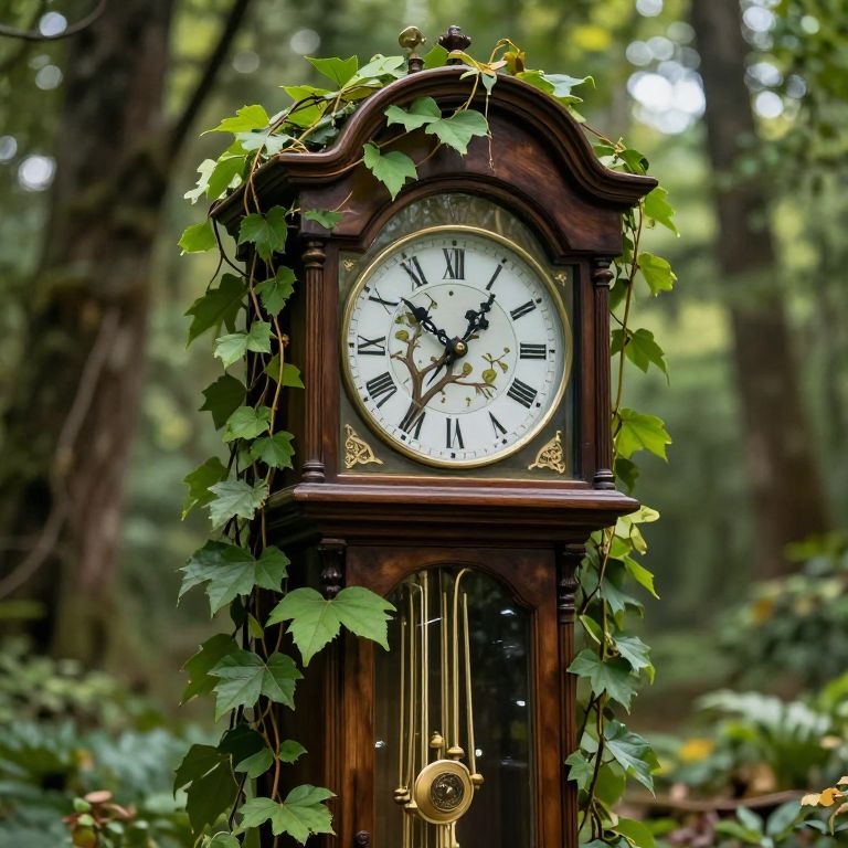 Photograph of an antique wooden grandfather clock with a white face and black Roman numerals, adorned with green ivy vines. The clock has ornate gold detailing on the corners and a brass pendulum hanging below. The background features a blurred, lush forest with tall trees and dense greenery, adding a serene, natural atmosphere. The clock's elegant, vintage design contrasts with the vibrant green foliage, creating a picturesque and timeless scene.