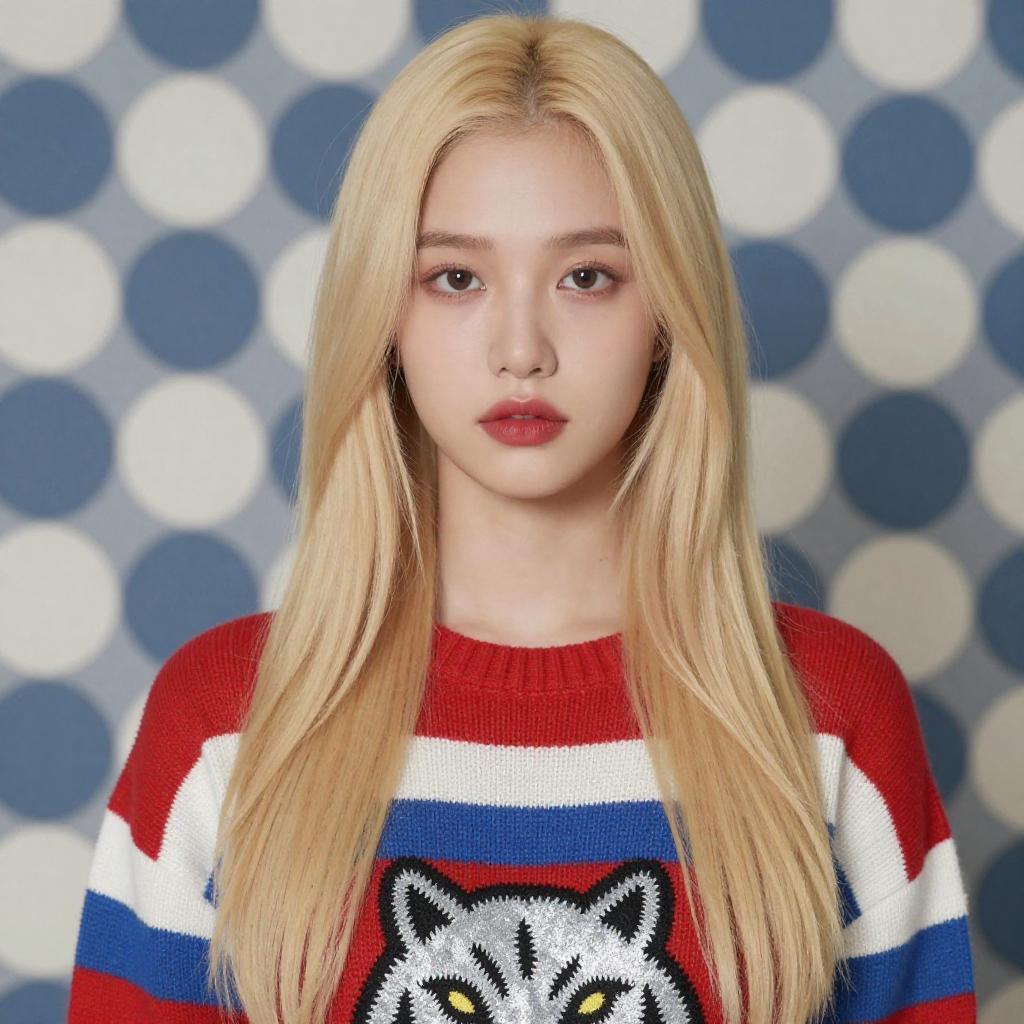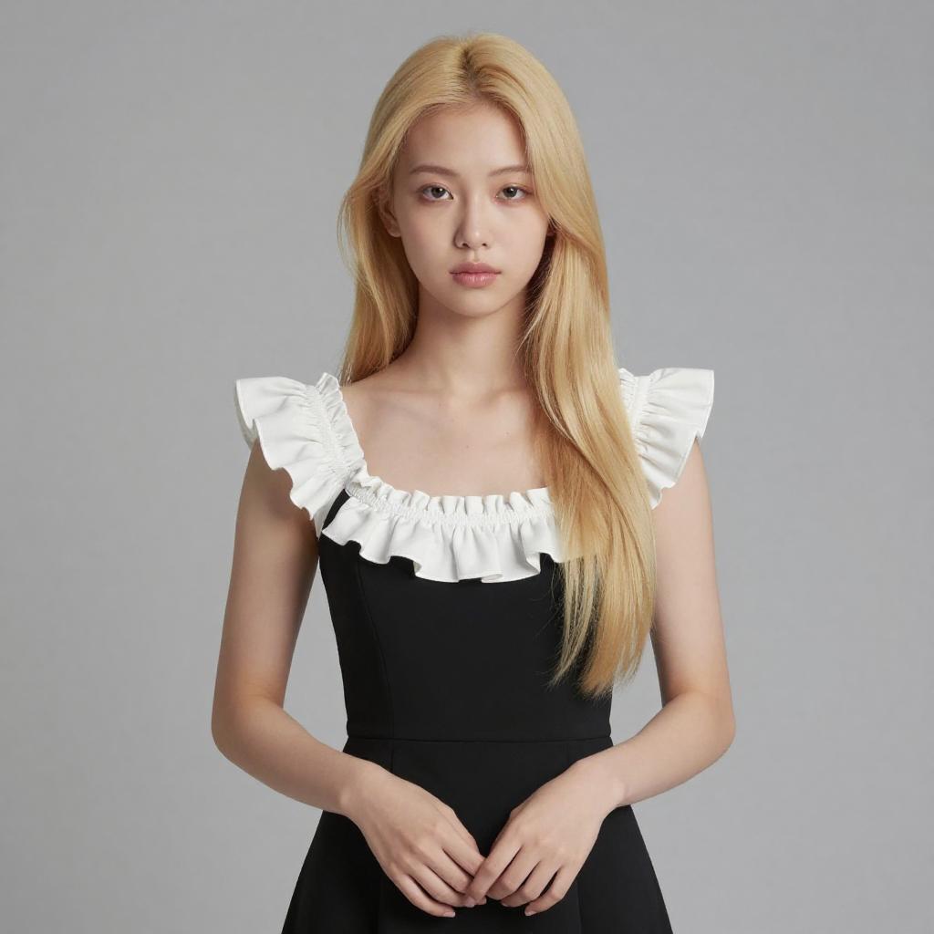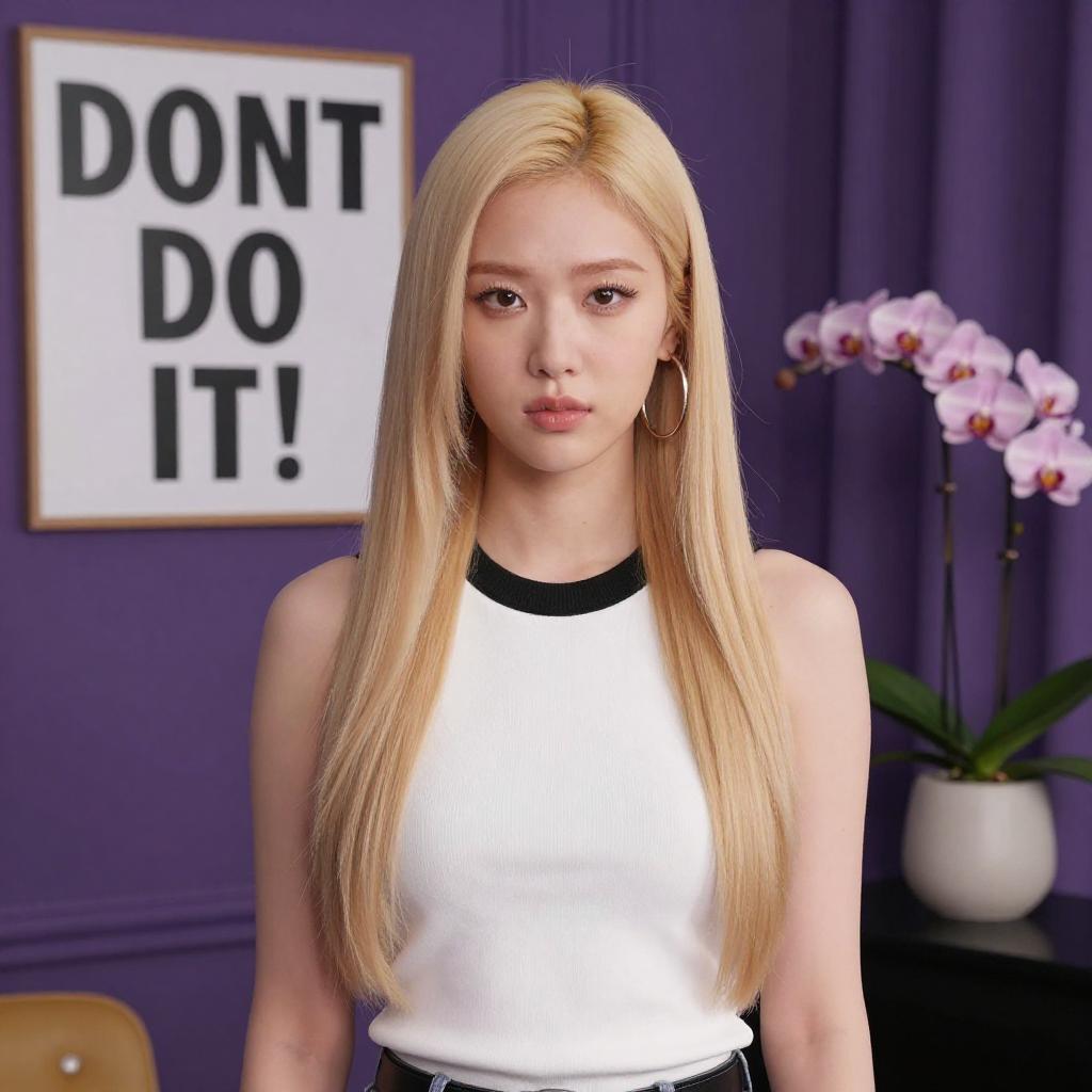 Photograph of a young woman with long, straight blonde hair, wearing a white and black sleeveless top with black trim. She has large hoop earrings and a serious expression. She stands in front of a purple curtain with a sign that reads "DON'T DO IT!" in bold letters. A vase of pink orchids is on a black table to her right.
