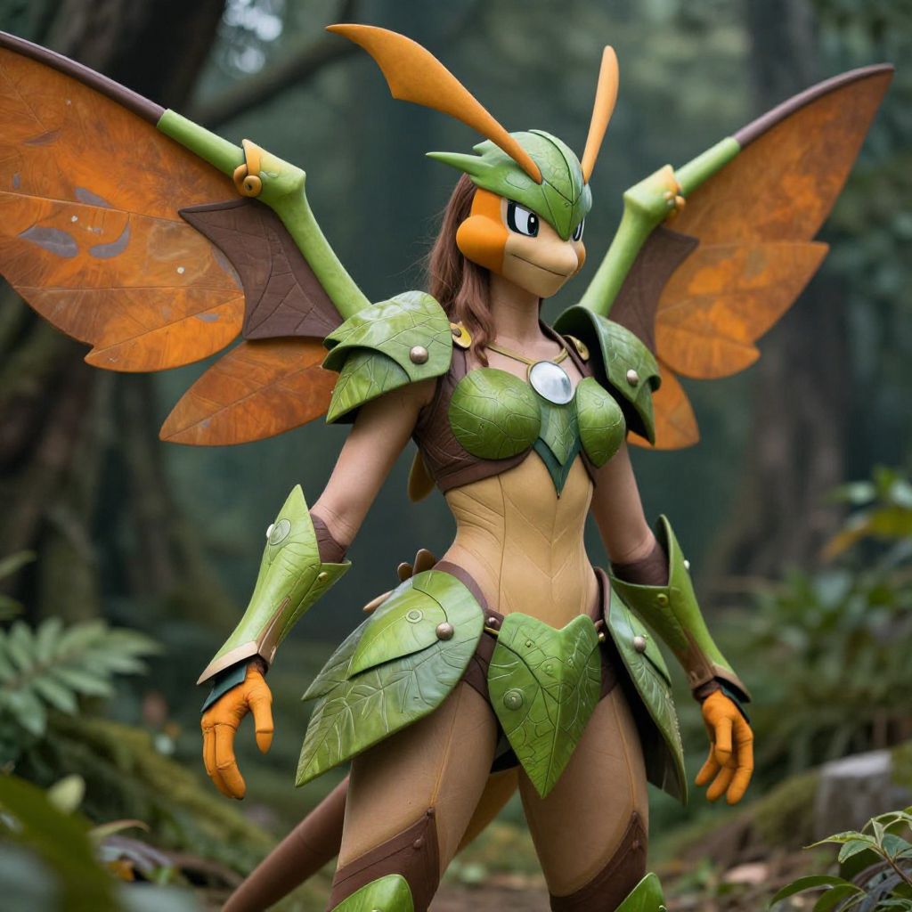 An ultra-detailed still photo of a woman cosplaying as the Pokémon Scyther, featuring intricate, leaf-like armor and wings. The artistic portrayal captures the essence of the character with a human touch, highlighting the vivid green and orange colors against a lush, forested background.