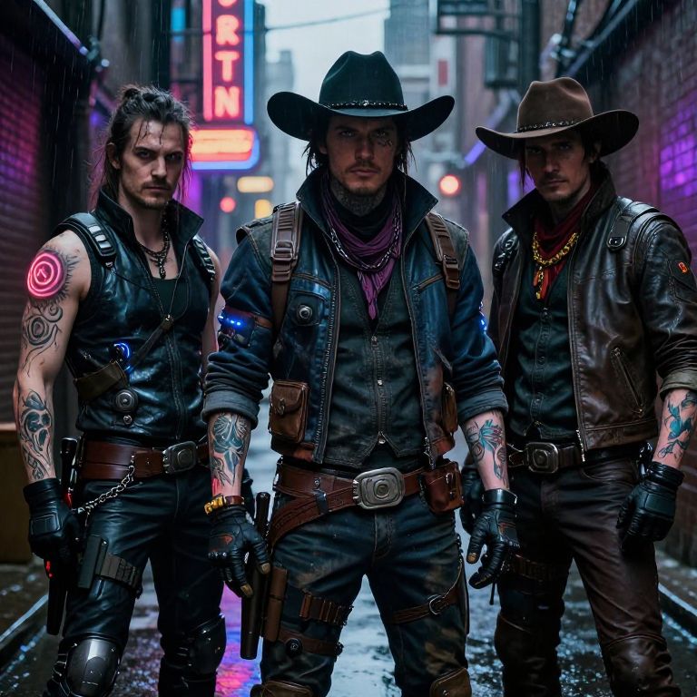 Outlaws with futuristic cyberpunk gear in a neon-lit alley, blending old western motifs with high-tech gadgets, glowing tattoos, rain-soaked streets, intense expressions, cinematic lighting, detailed urban background