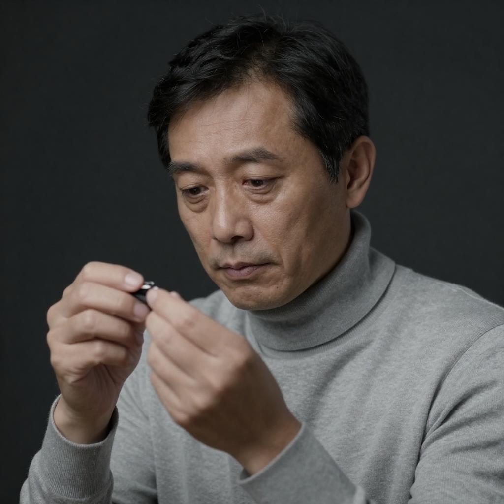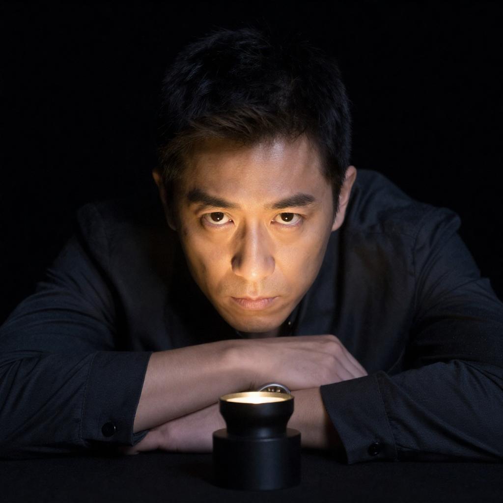 Photograph of a man with short, dark hair in a black suit, sitting at a desk under a bright, angled lamp. He holds a white, gloved hand, examining it closely. A large, vintage camera is on the desk to his right. The background is a dimly lit, gray room with a door and a wall-mounted light switch.