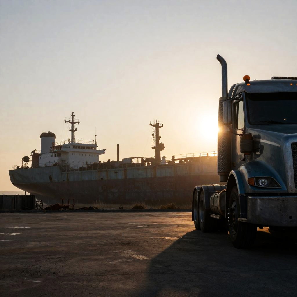 A patinated steel totem set against the backdrop of an abandoned shipbreaking yard, captured in a wide-angle low-angle view at sunrise, where a big rig truck occupies the right third of the frame. The scene is illuminated with moody cinematic rim lighting with warm sun shafts and volumetric haze, resembling a cinematic still, delivered in stunning 8k photography.
