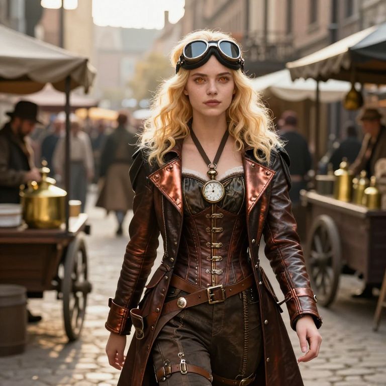 A naturalistic photo of a girl with wavy blonde hair and bright amber eyes, wearing a classic steampunk outfit—a corseted top with brass straps, a long leather coat lined with copper plates, goggles on her face, and a pocket watch-shaped pendant—walking through a bustling 19th-century-style city market with steam-powered carts and old-fashioned brass vendors in a golden afternoon light.