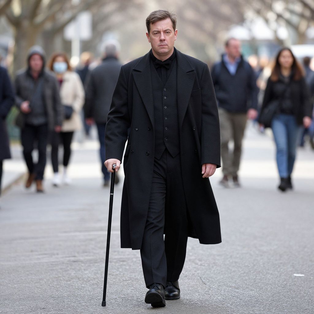 Mcr Black Parade Costume, dressed in black walking down a street with a cane