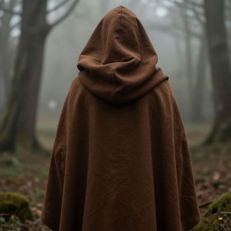 Photograph of a dark brown, intricately patterned cloak with a hood, surrounded by floating pages in a dimly lit library.