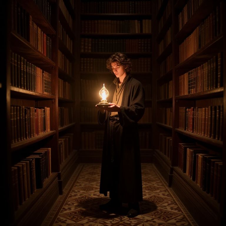 Close-up of a figure wearing a brown cloak with intricate embroidery, dimly lit ancient library, magical floating books around, mystic and enchanting vibe