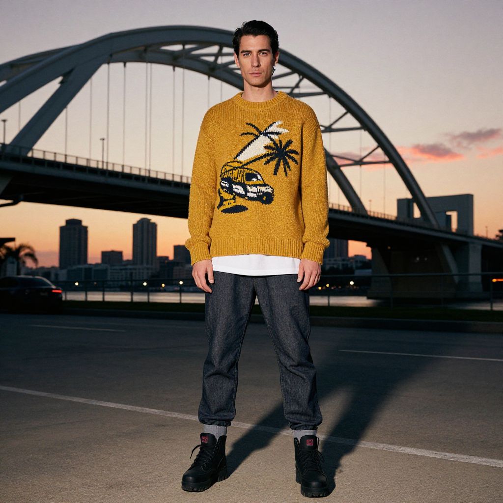 A man, tie-dye oversized hoodie, loose-fit khaki shorts, vibrant slip-on skate shoes, summer streetwear, modern steel arch bridge, city skyline in the background, vibrant sunset casting shadows, calotype process, relaxed expression.Man has masculine face and piercing eyes
