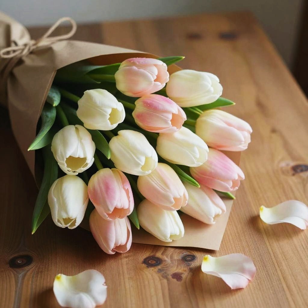 Tulipanes arranged in an elegant bouquet, soft pastel colors, wrapped in rustic paper with twine, placed on a wooden table with scattered flower petals, cozy and warm atmosphere with natural light