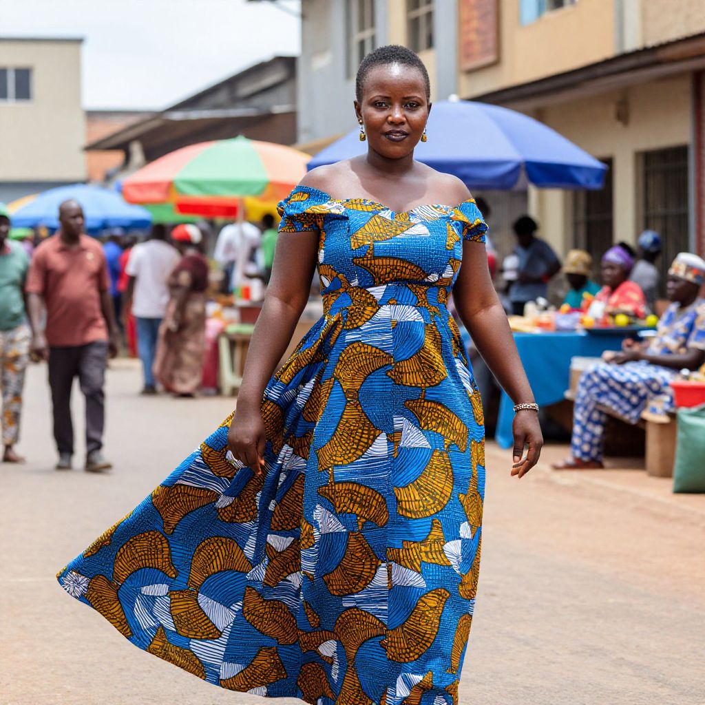 A dynamic photo of a Kenyan woman in her early 40s with a strong, confident expression, wearing a formal Ankara official wear women's costume — featuring intricate geometric patterns in indigo and gold on a long, flowing dress — posing in front of a colorful traditional market with bustling activity and local vendors in the urban setting.. The woman has big tits and cute face