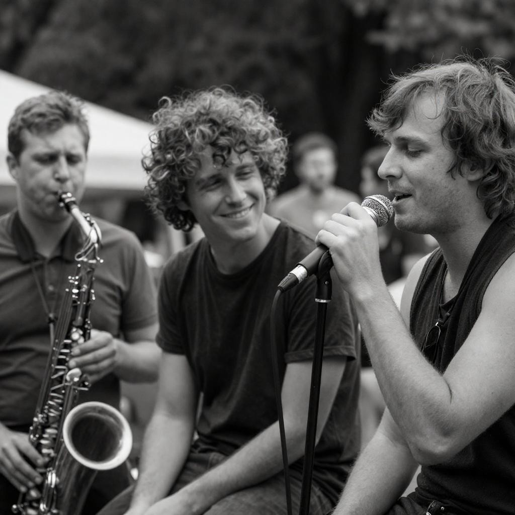 Black-and-white photograph of three male musicians outdoors. The central man with curly hair and a dark t-shirt leans forward, smiling. To the right, another man with shaggy hair sings into a microphone, wearing a sleeveless dark shirt. On the left, a third man plays a saxophone, partially visible. Background includes blurred trees and a crowd.