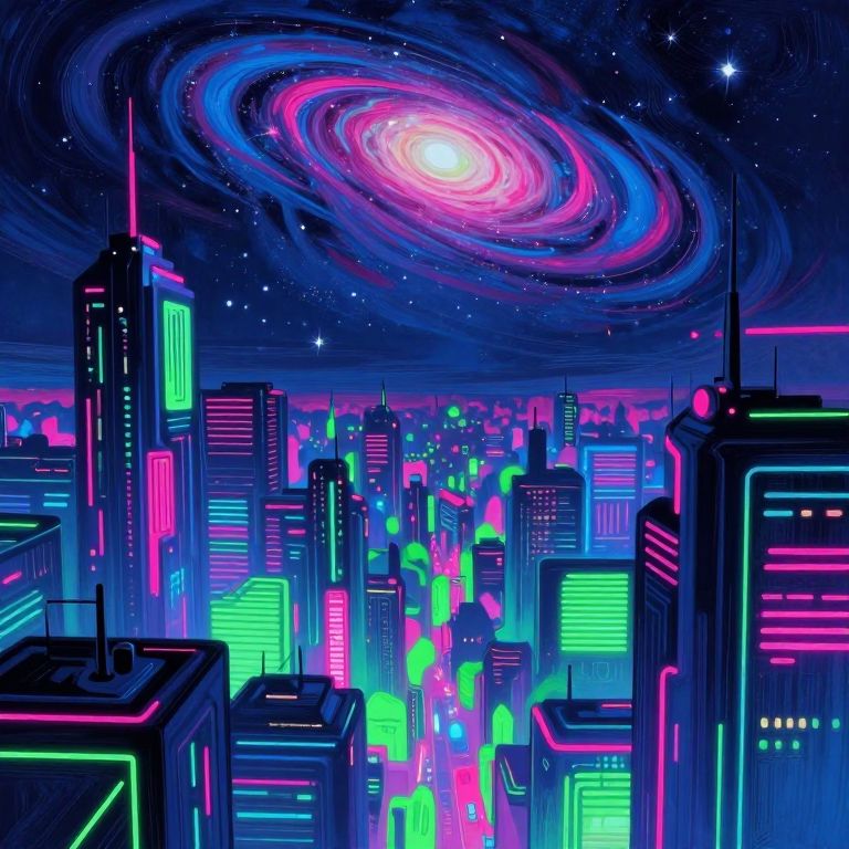 A captivating cyberpunk dreamscape unfolds, inspired by the intricate worldbuilding of science fiction and the surrealistic style of an iconic artist. From an unconventional viewpoint, we observe an urban landscape filled with skyscrapers embellished with glowing neon lights and holographic projections that dance like fireflies in the darkness. This scene is painted in a palette of electric blues, magentas, and lime greens, with smooth brushstrokes reminiscent of surrealist techniques blending into sharp, angular lines of futuristic architecture. As our gaze ascends to the heavens above, we are drawn to the swirling vortex of a distant galaxy—a cosmic tapestry that seems to beckon us towards its mysterious heart. The emotional journey within this image shifts from thrilling anticipation to awe-inspired wonder, inviting viewers on an exploration through the core of a world where technology and imagination intertwine in harmonious splendor.