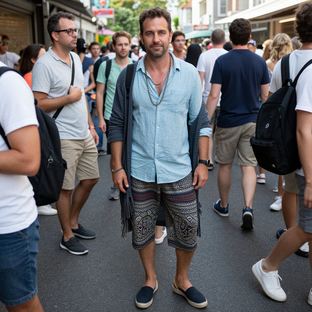 A man, lightweight chambray shirt, patterned culottes, espadrilles with jute soles, long cardigan with fringe, layered necklaces, bustling crowds, disposable camera style, relaxed smile, vibrant energy.Man has masculine face and piercing eyes
