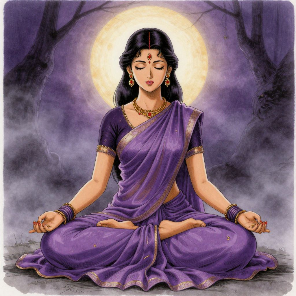 Action Mysterious atmosphere fog:: india woman wearing saree in lotus position, purple colour:: Yoshitaka Amano style, colour sketch::,
