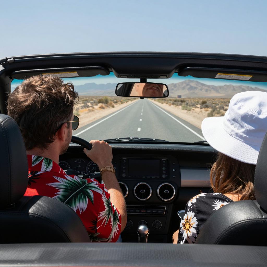 Three people in a red convertible on a highway. Driver, wearing black cap and sunglasses, holds steering wheel. Passenger in front, brown-haired woman, wearing sunglasses, smiles. Passenger in back, man in red shirt with white graphic, plaid cap, sunglasses. Yellow truck in background. Daylight, clear sky. Trees and buildings in distance.