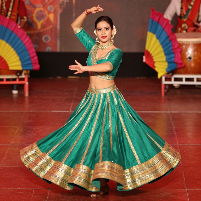 A traditional dancer in her 20s with a delicate oval face, high cheekbones, and dark, expressive eyes, dressed in a vibrant holud lehenga with cascading golden thread patterns, performing a traditional folk dance on a red-tiled stage during a festival, with colorful fans and drums in the background, the light reflecting off the silk fabric in shimmering detail.