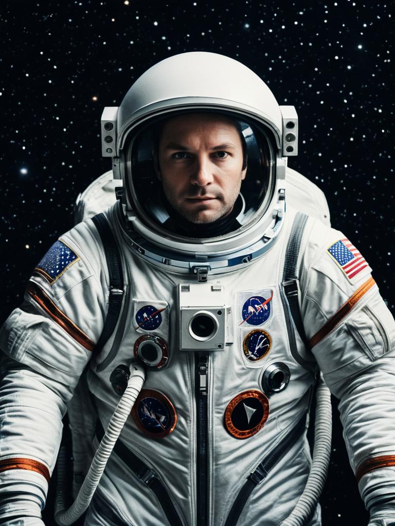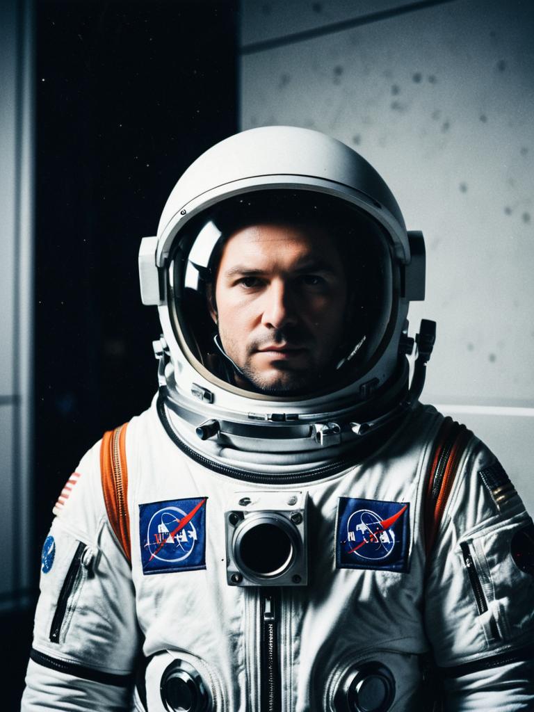 Man in Astronaut Costume, cinematic realism, heroic space portrait