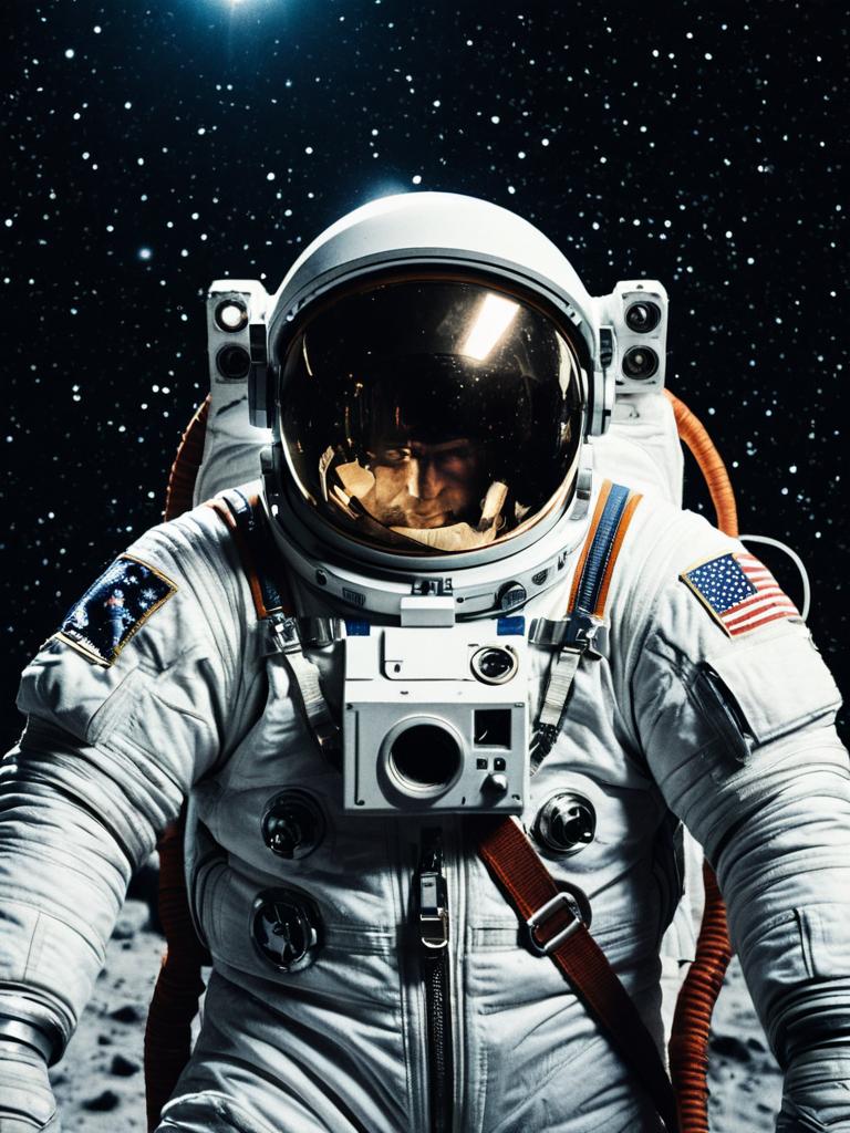 A close-up portrait of a man wearing a detailed white astronaut spacesuit featuring the American flag patch. The helmet visor reflects light, and the background showcases a star-filled outer space environment. The image captures cinematic realism and a heroic space exploration theme.