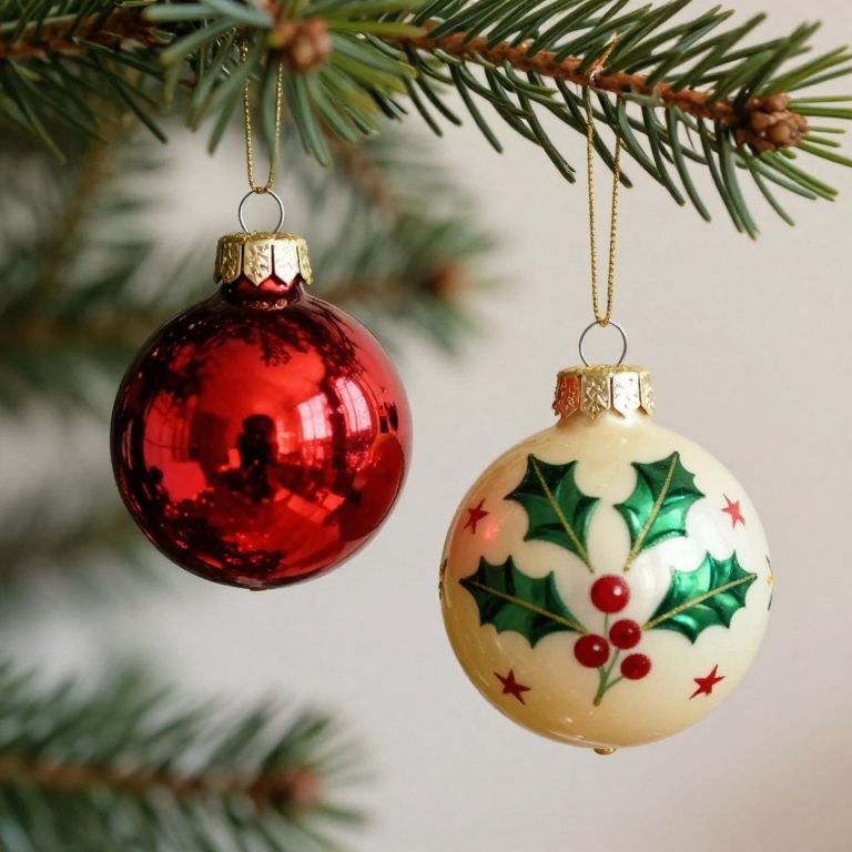 Two vintage Christmas ornaments hang gracefully beneath pine branches, featuring a glossy red bauble reflecting light and a cream-colored ornament adorned with green holly leaves, red stars, and berry accents.