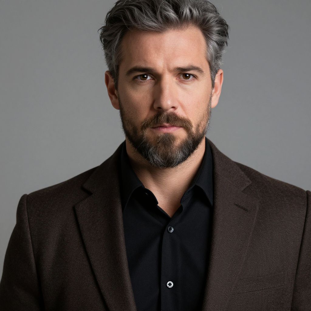 Photograph of a handsome middle-aged man with gray hair, beard, and serious expression, wearing a black button-up shirt and dark brown blazer,