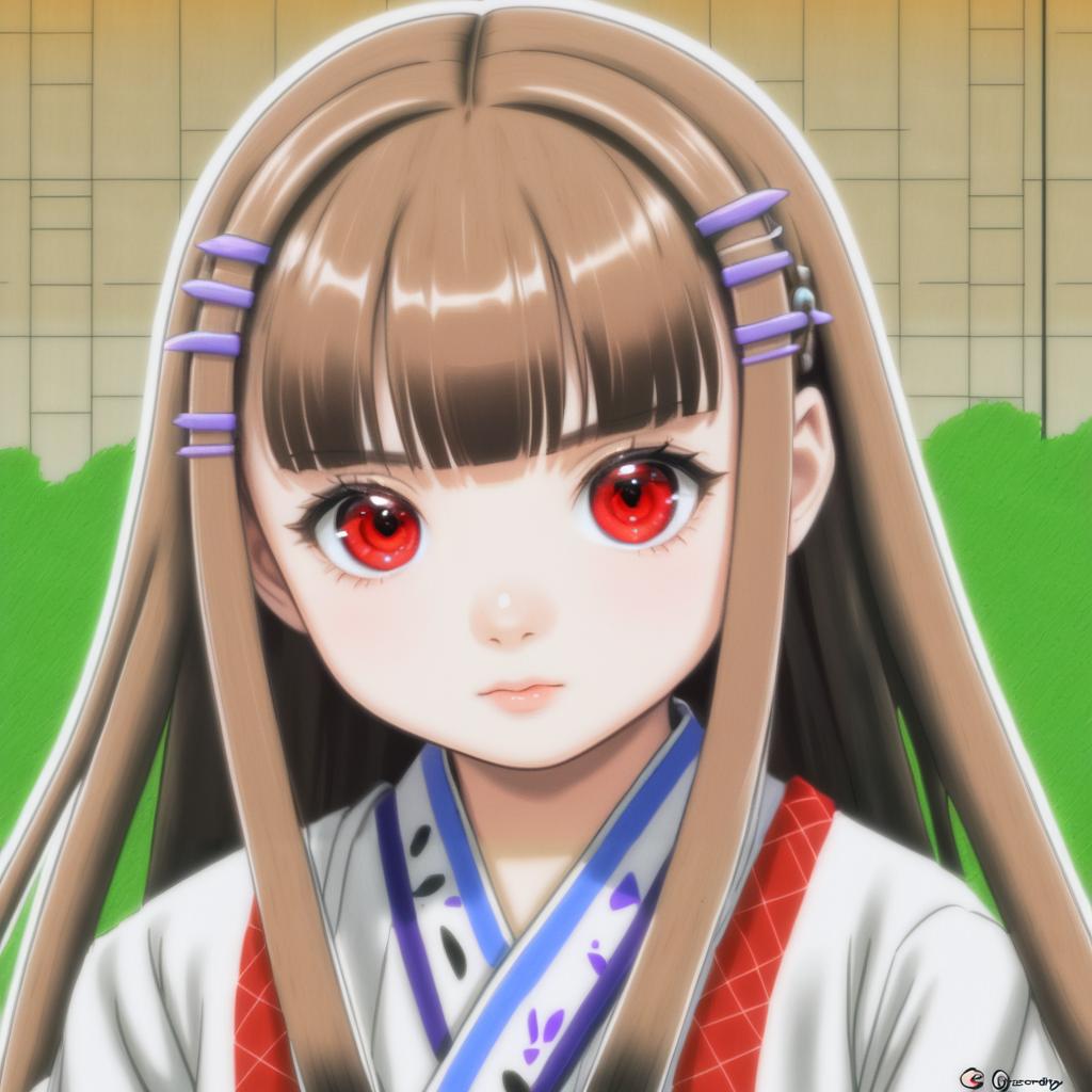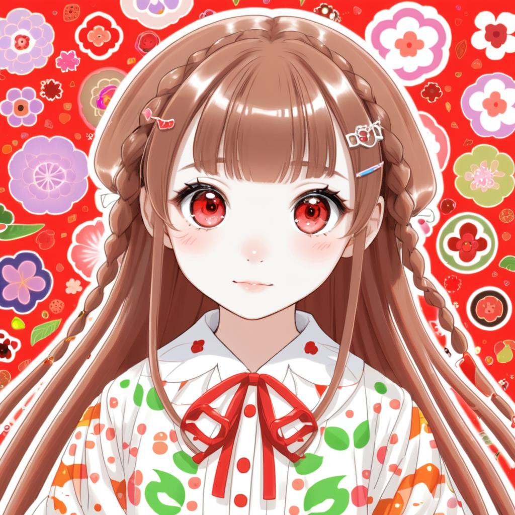 Close-up of an anime girl with long brown hair and braided bangs, featuring large red eyes and a gentle expression. She wears a white blouse with red trim and a brown pinafore dress tied with red ribbons. The background is a green pattern with white circular elements. Hairclips and red flower accessories adorn her hair.