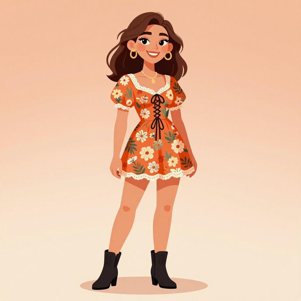 Woman with pretty face and pretty hair. smiling Woman, boho chic, floral print mini dress in warm tones, scoop neckline with lace trim, short puff sleeves, fitted bodice with front lacing detail, flared skirt, black ankle boots with embossed details, studio backdrop with a gradient of peach to beige tones. --sref 1467