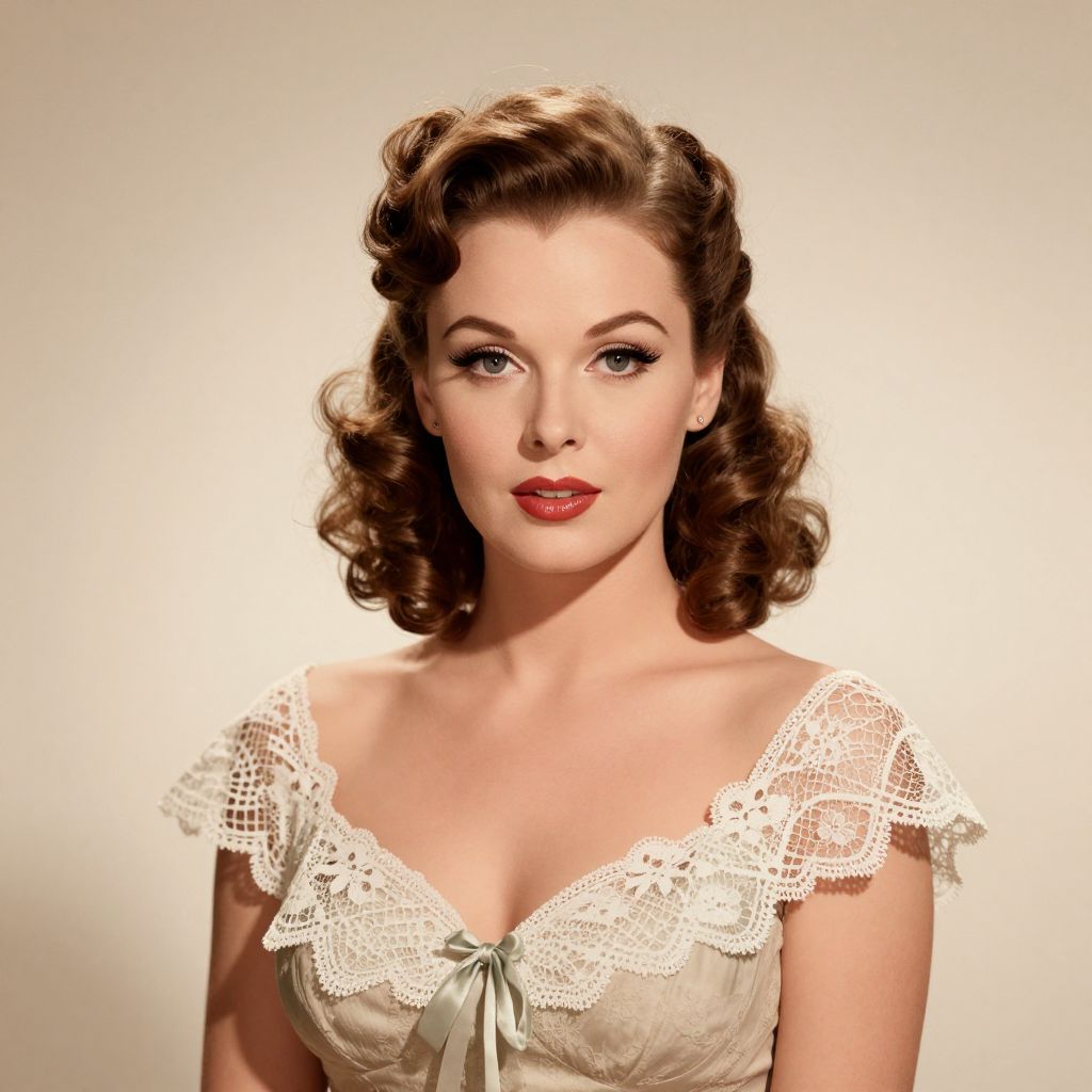 A vintage-inspired digital illustration featuring a woman with classic Hollywood curls, adorned in an elegant lace-trimmed dress, evoking the timeless charm reminiscent of Shirley Temple's iconic style.