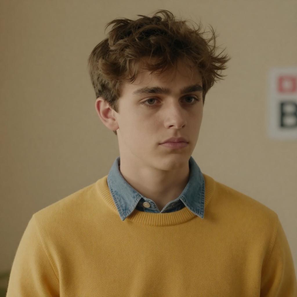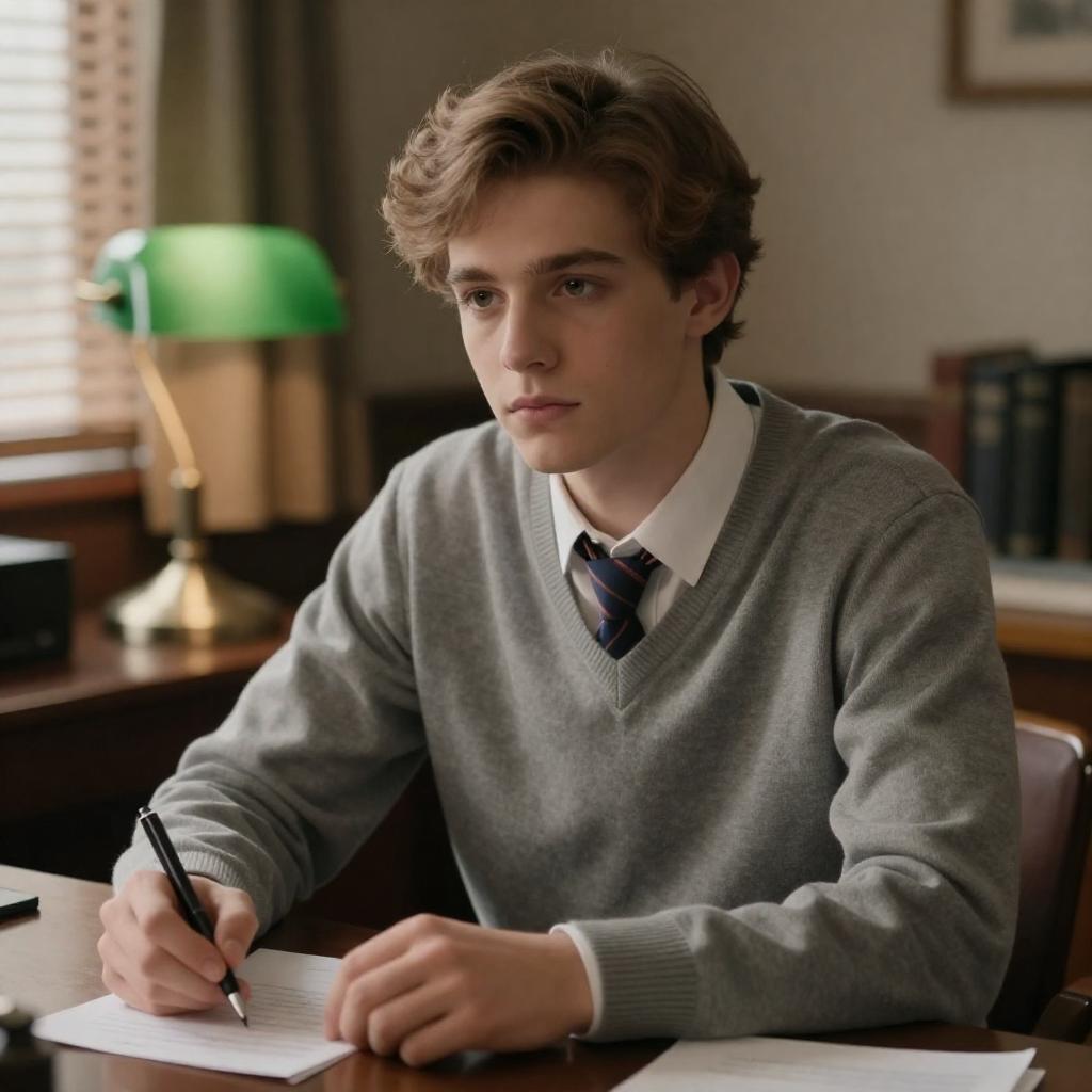Photograph of a young man with light brown hair, wearing a gray V-neck sweater over a white shirt with a striped tie, sitting at a wooden desk. He holds a pen, looking slightly to the side. Background includes a green desk lamp, window with blinds, and brown curtains.